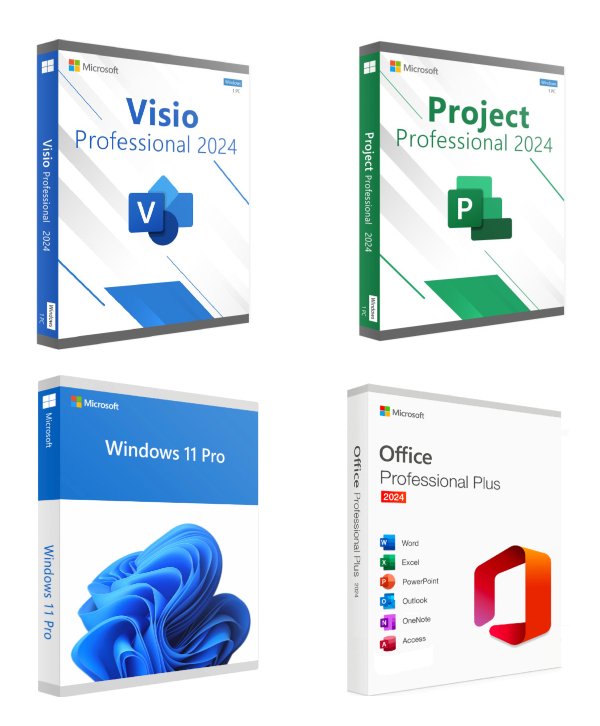 Windows 11 Pro, Office 2024 Professional Plus, Visio 2024 Professional e Project 2024 Professional.